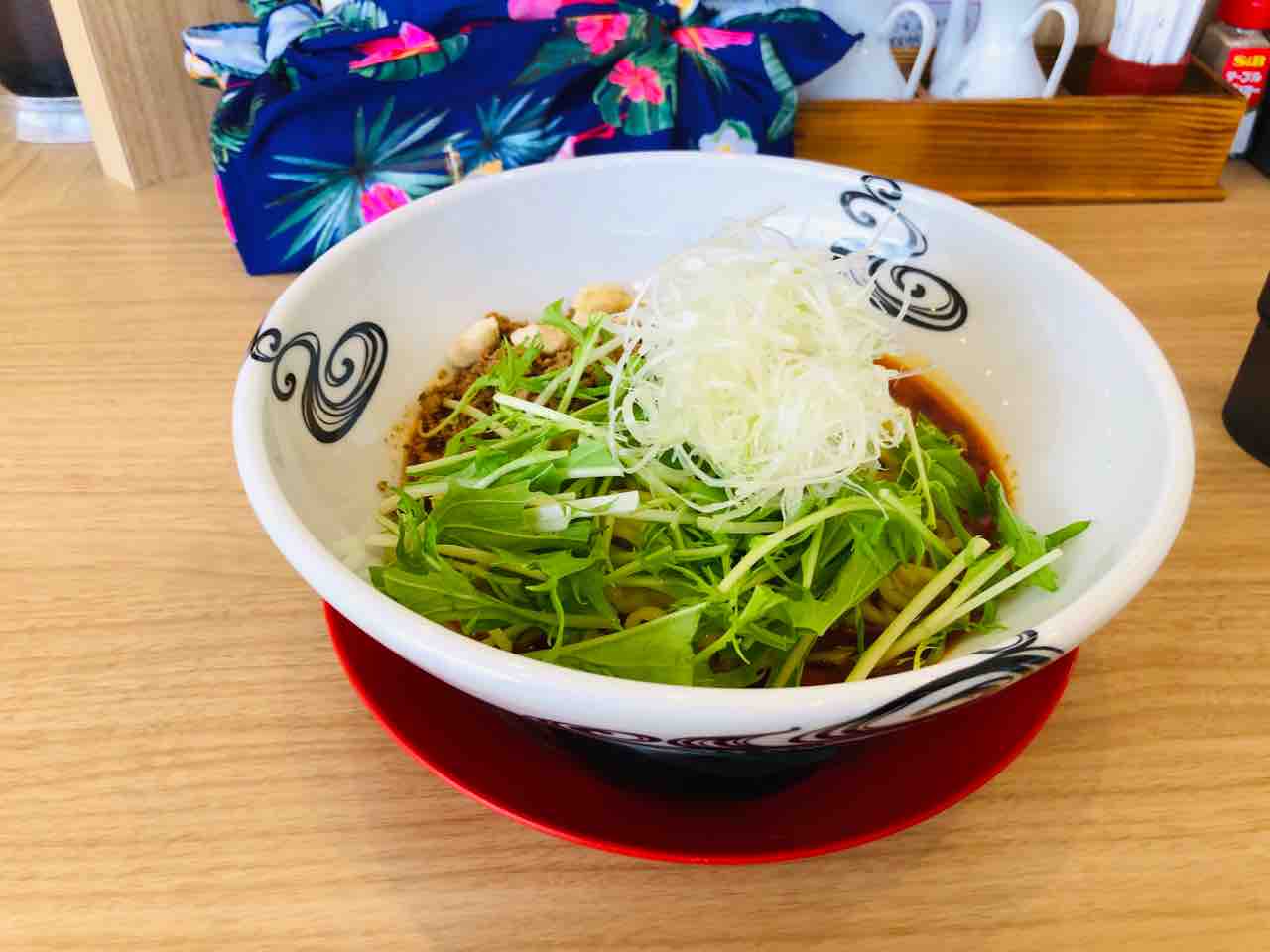 肉味噌の量も結構あり、水菜、白髪ネギ、カシューナッツのアクセントも良いです。