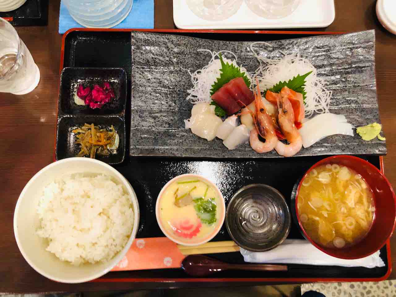 内容は、お米、味噌汁、漬物、きんぴらごぼう、茶碗蒸し、刺身7点盛りです。