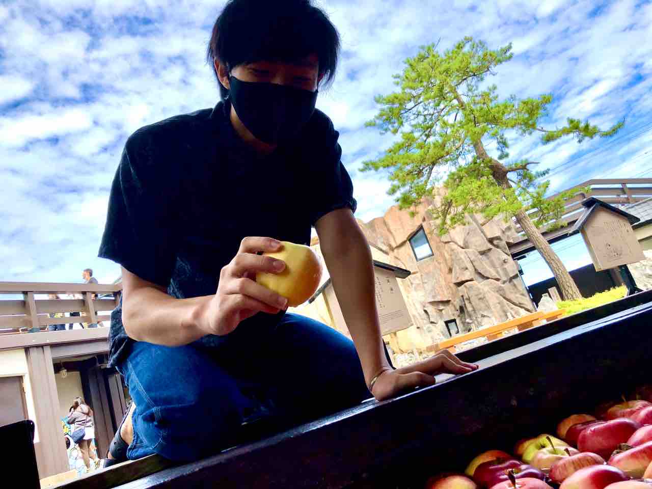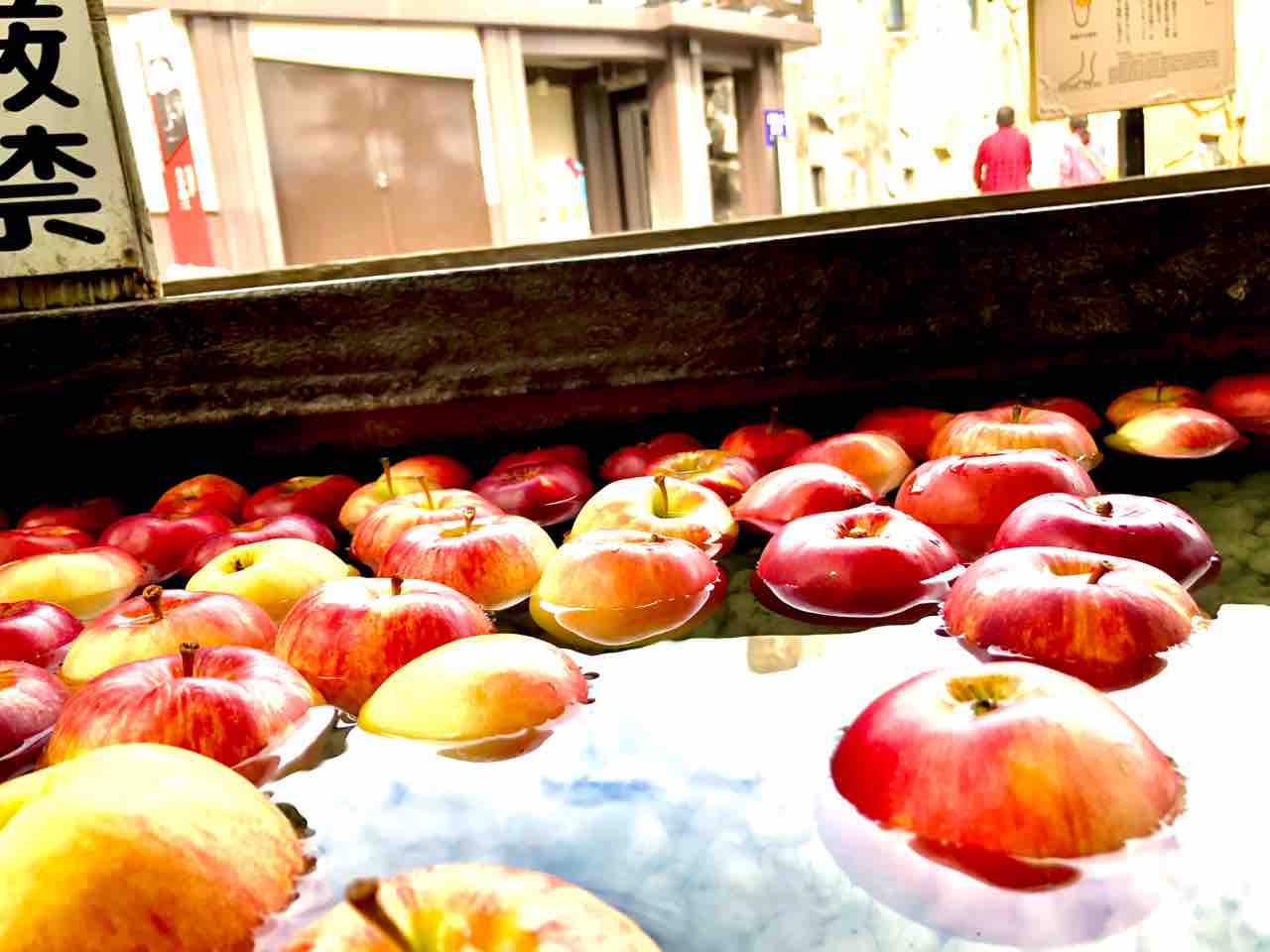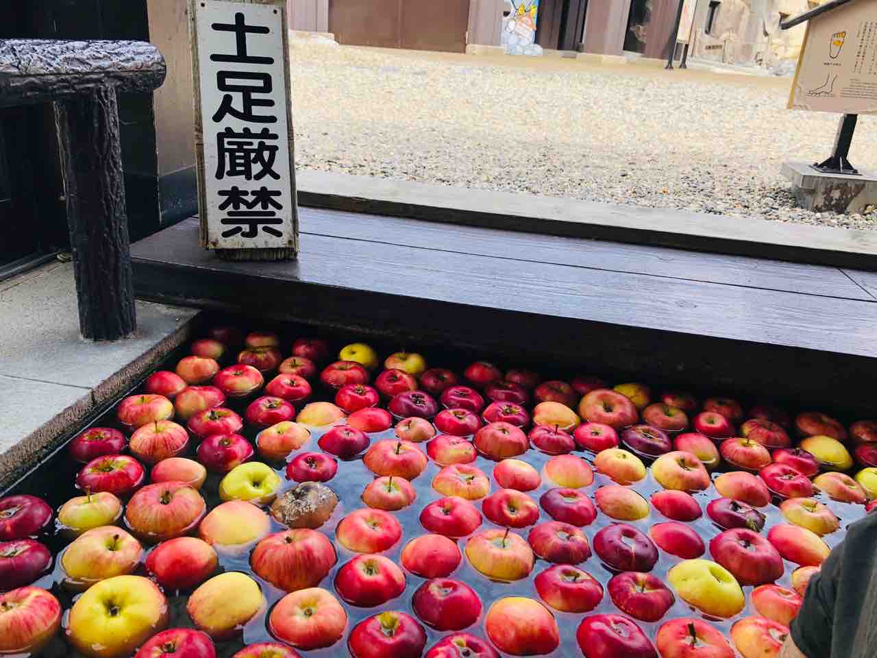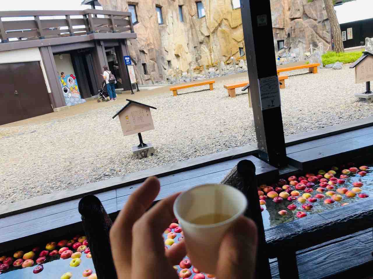 なんと!足湯にりんごが浮かんでいるではありませんか。これ映えるん違うかと思いまして…