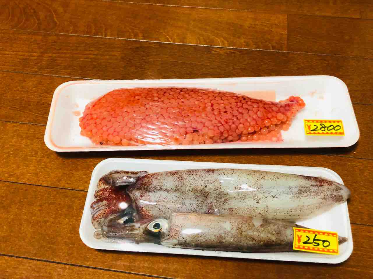 出雲のお魚屋さんではイカと筋子を購入しました。