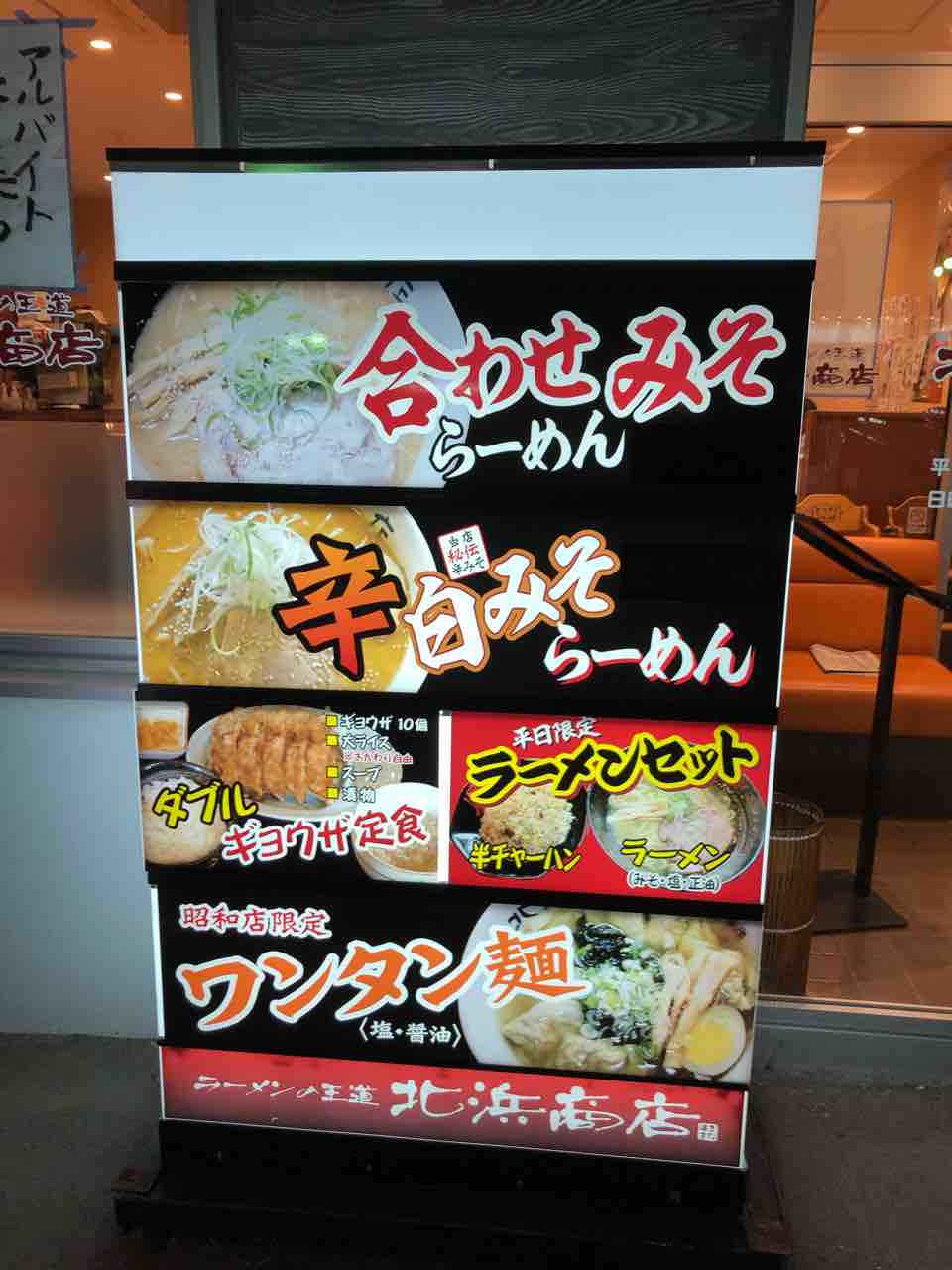 函館市昭和の北浜商店に行ってきました。 2020年10月05日 昭和タウンプラザ内にいる時にラーメン食べたい、ラーメン食べたいラーメン食べたい衝動に駆られまして北浜商店 さんに向かいました。所在地 北海道函館市昭和1-29-5営業時間 11時〜21時電話番号 0138-45-9229駐車場 多数有Webサイト こちらから地図は こちらから店舗外観です。入店します。先客は結構いた模様。メニューです。壁にもメニューがあります。食べるものは元々決めていたので 白みそラーメン (880円税込) と 餃子5個 (460円税込)です。割と混み合っていたのか20数分待った後にやってきました。真上から。少し引いたところから。多少脂ぎってますがまろやかなスープです。割と好きなスープです。麺は太めでスープも絡んでくれます。ラーメンから5分遅れて餃子登場です。ここの餃子を食べるときは みそダレ一択かもしれません。餃子にみそダレを付けて…甘いみそダレと餃子の相性は抜群で美味しいです。今度行った際には みそダレ買って帰ろうかなと思うのであった。 < 前の記事次の記事 > コメント コメントフォーム 名前 コメント 記事の評価 リセット リセット 顔 星 情報を記憶 コメントを投稿する