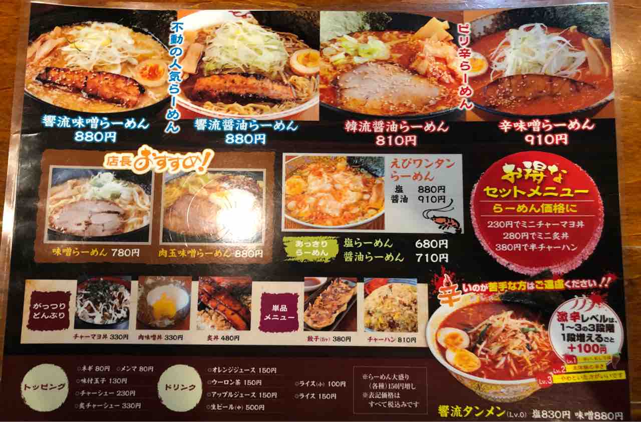 函館市北浜町のラーメン響に行ってきました。 2020年10月24日 先日もラーメンを食べてきまして伺ったお店は 函館市北浜町のラーメン響 北浜本店 です。所在地 北海道函館市北浜町2-12営業時間 11時〜15時、17時〜21時電話番号 0138-43-6699駐車場 店舗横に有Webサイト こちらから地図は こちらから店舗外観です。店内の様子です。割と広めの店内です。メニュー表です。メニュー自体はそんなに多くないです。肉玉味噌ラーメンが気になりまして注文しました。待つ事4分弱で 肉玉味噌ラーメン (880円税込)がやってきました。くるの早っ!具材はキャベツ、長ネギ、モヤシ、メンマ、温玉、チャーシュー、肉味噌です。麺はよく見かける黄色い麺です。キャベツに肉味噌を少し絡めてみました、肉味噌は甘辛い味付けです。チャーシュー温玉 ぷるんぷるんデス少しピリリと辛い味噌ラーメンで、温玉を崩し肉味噌を溶かしながら食べるとまろやかになり味の変化が楽しめます。ふと思ったのが 響のラーメン 10年ぶりでした。 < 前の記事次の記事 > コメント コメントフォーム 名前 コメント 記事の評価 リセット リセット 顔 星 情報を記憶 コメントを投稿する