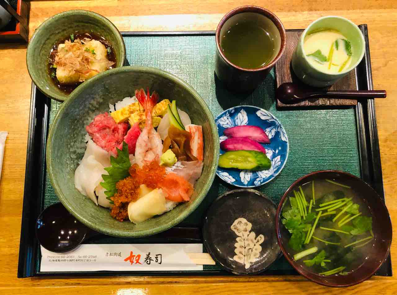 内容は 海鮮丼、揚げ豆腐、茶碗蒸し、味噌汁、漬け物です。