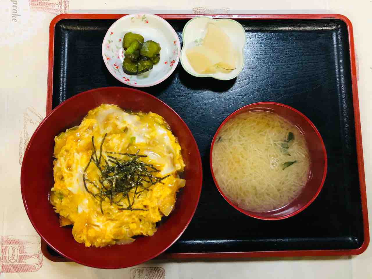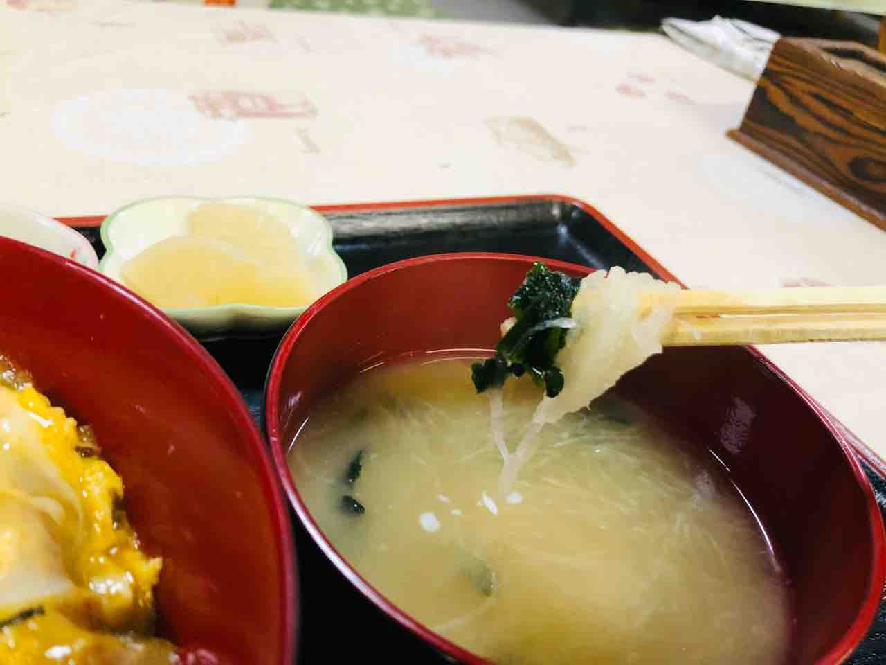 カツ丼食べる前に 大根の細切り けんの入った味噌汁をいただくとします。