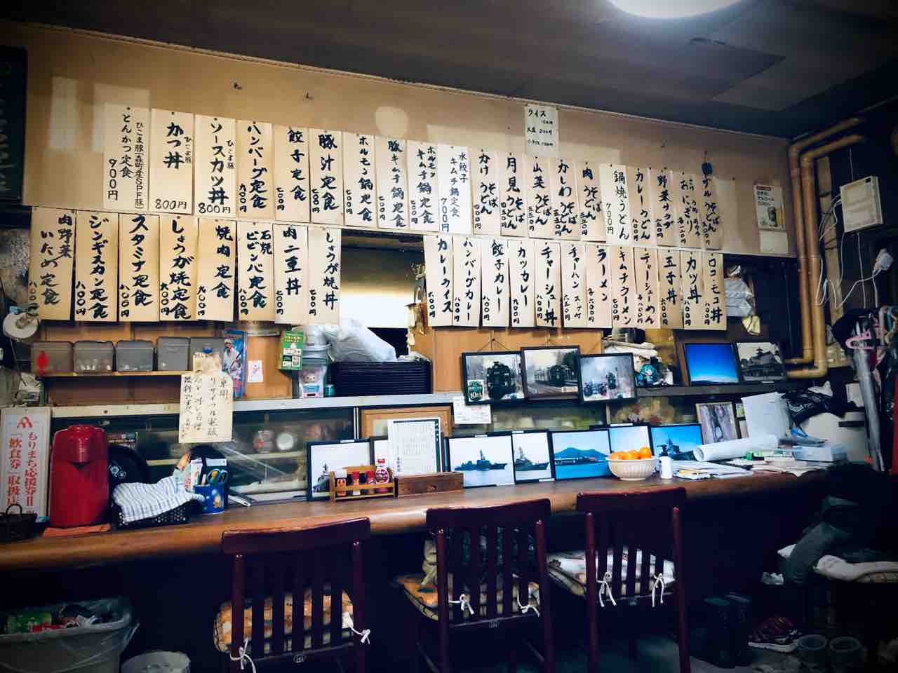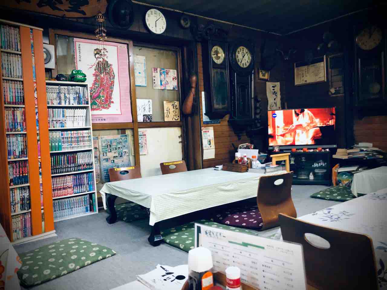 店内に入りますと汚い 昭和レトロ感が漂います。しかし何故か掛け時計、柱時計が沢山掛けられております。なお動いてない模様。