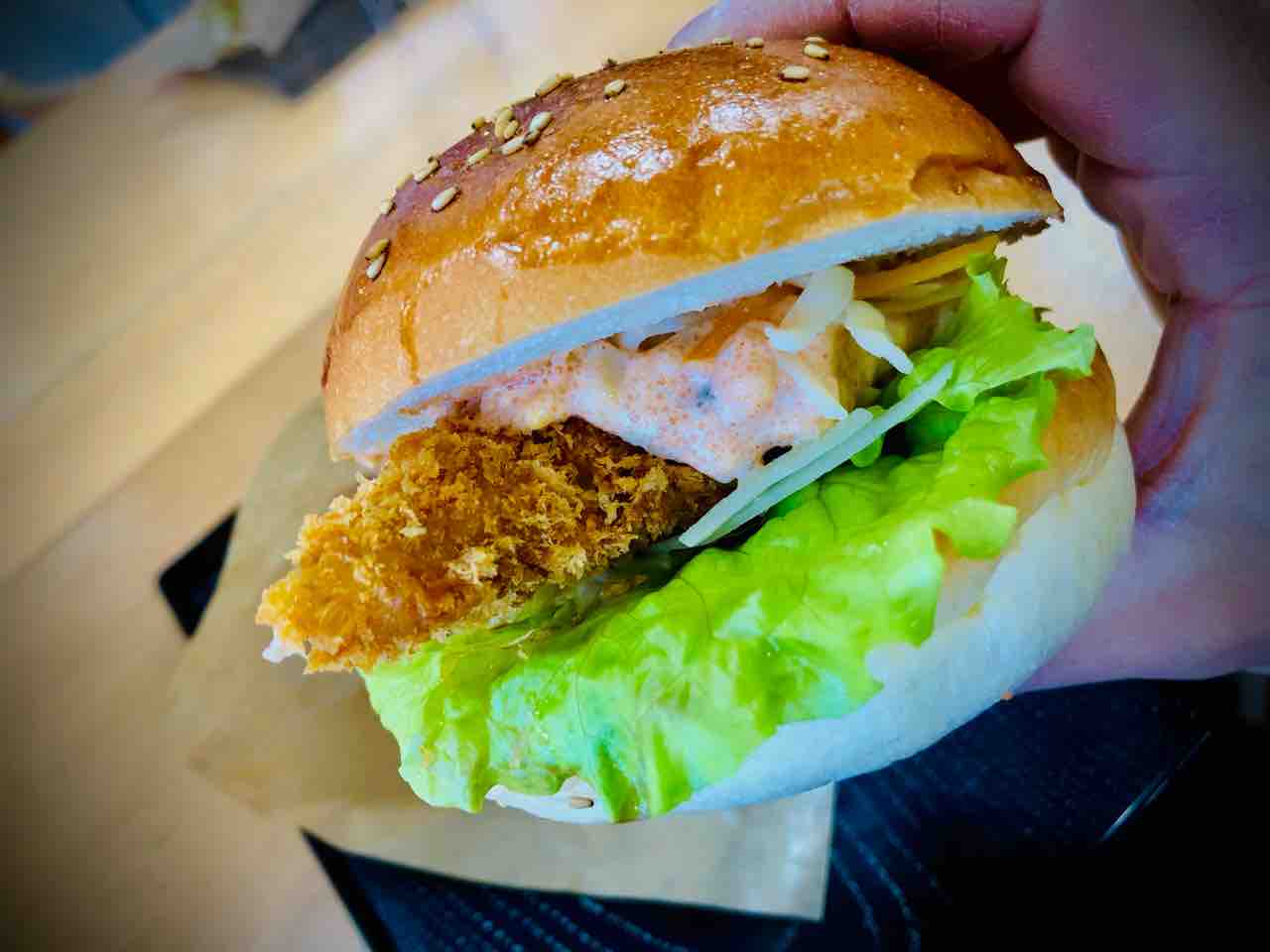 難点を言えば食べ辛い事ですね。バンズとバンズを圧縮して食べようとすると タラコマヨが出奔してしまいますし、普通に食べようとすると高さがあるので口の周りをソースで散らす勢いになるので口回りを拭く紙が必須になります。