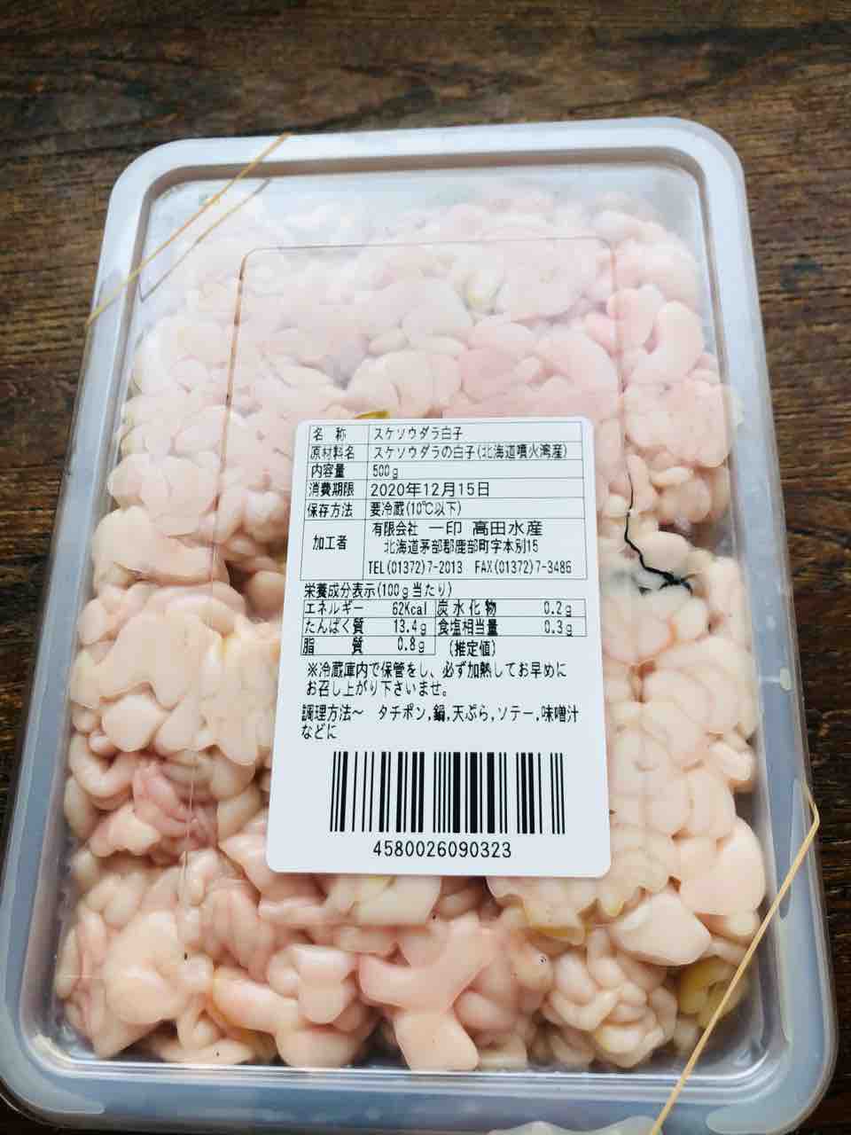先ず目的は スケソウダラ 白子です。ばりばり鮮度の良いものが500g 500円税込なら買わざるを得ませんよねって事で先週に引き続きです。