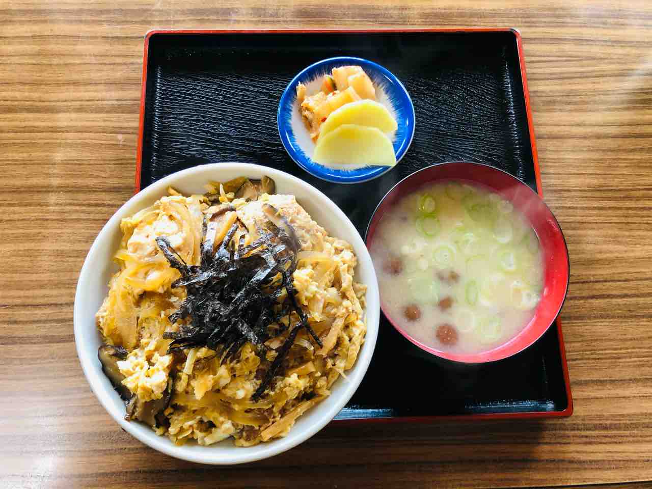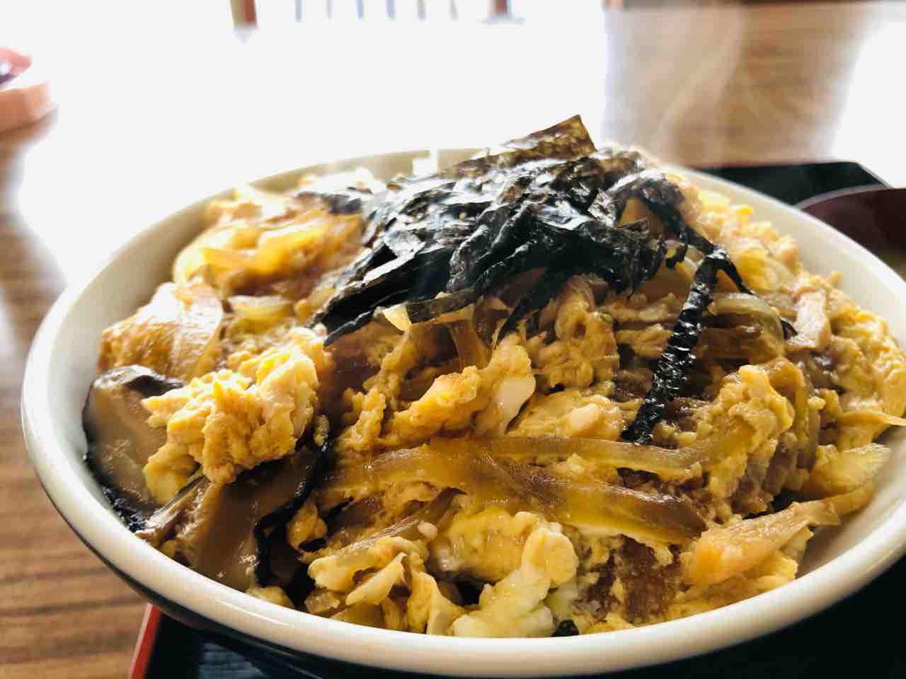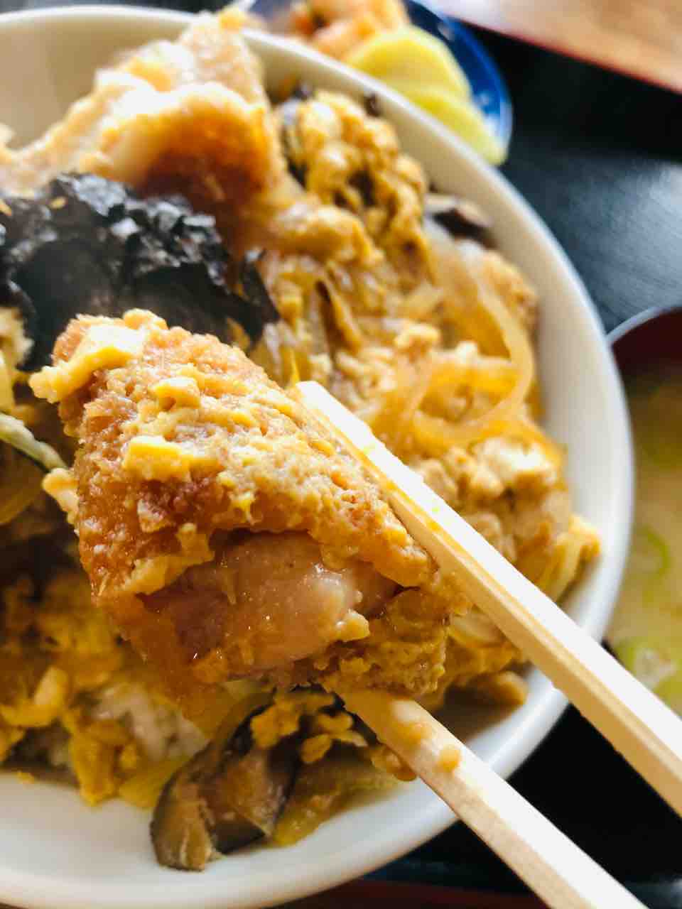 椎茸、玉ねぎ、海苔、豚カツ、卵とじのシンプルなカツ丼です。