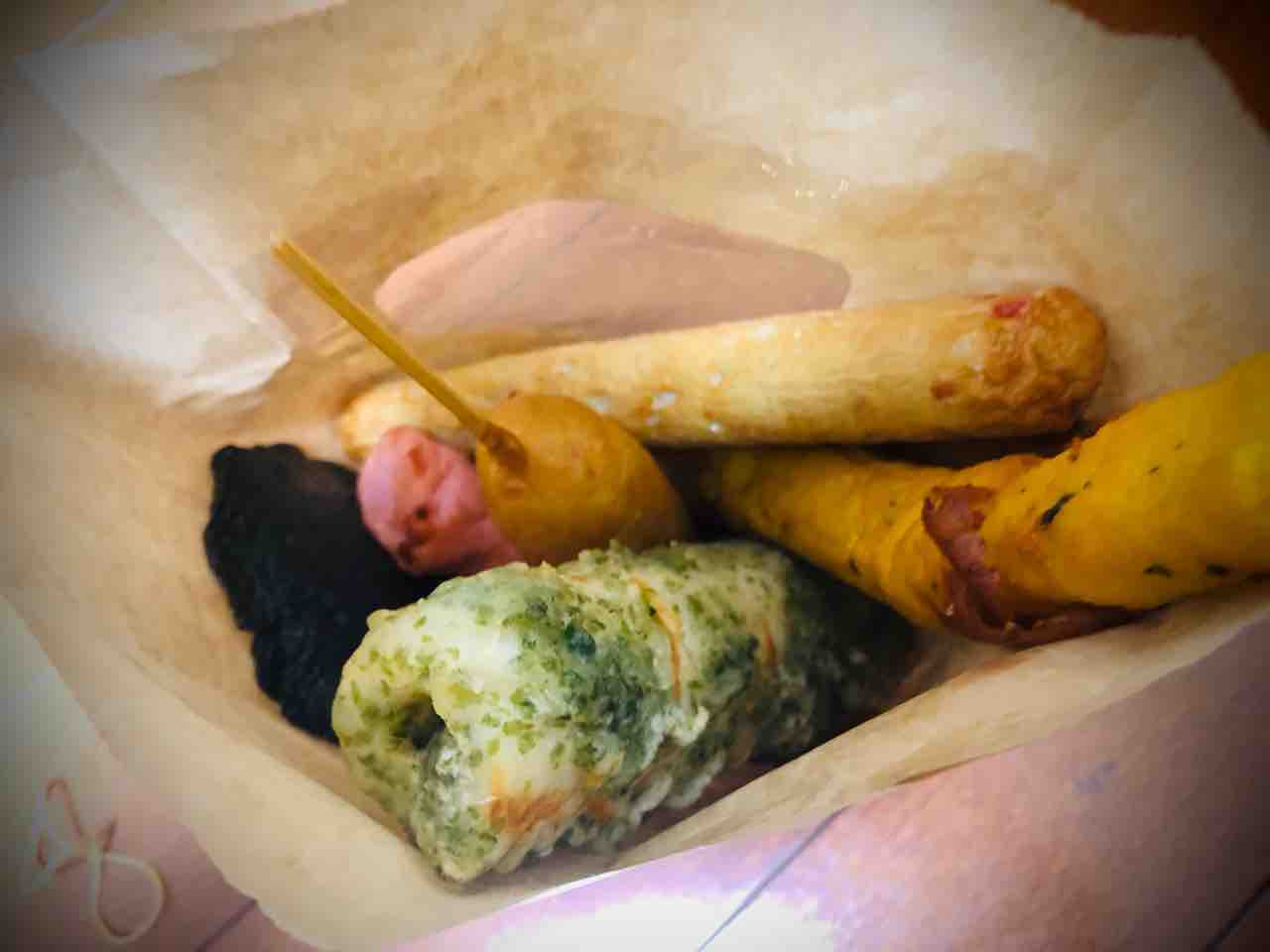 購入した蒲鉾達。bigちくわの磯部あげ、なるとドッグ、カニ天、かぼちゃ天、いか墨チーズ。