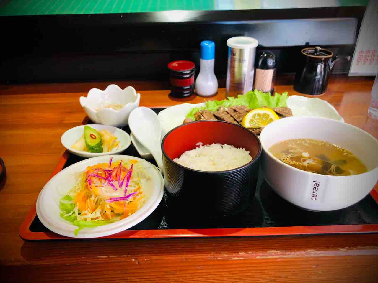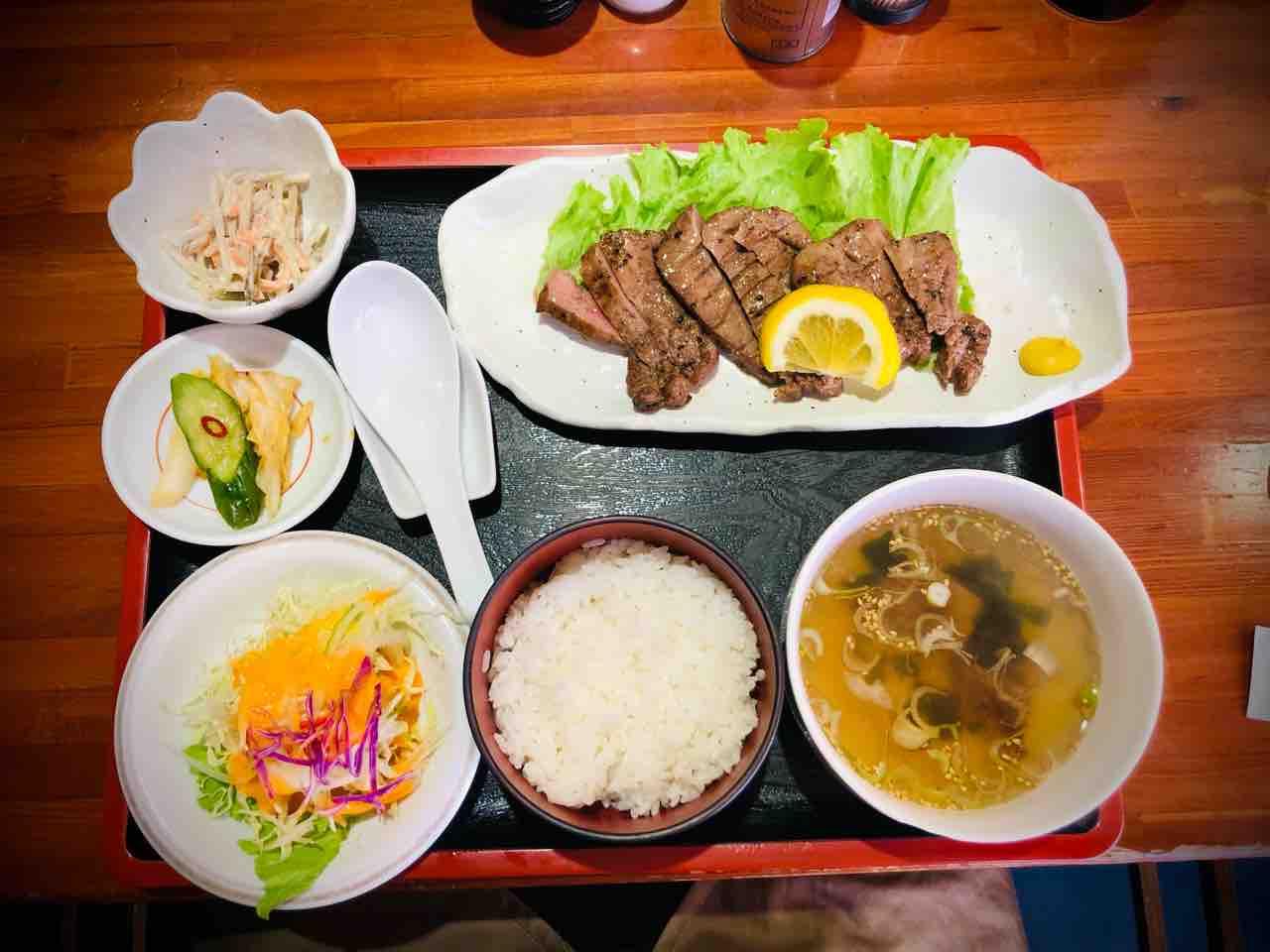 内容はご飯、スープ、サラダ、小鉢、厚切り牛タン、漬物です。