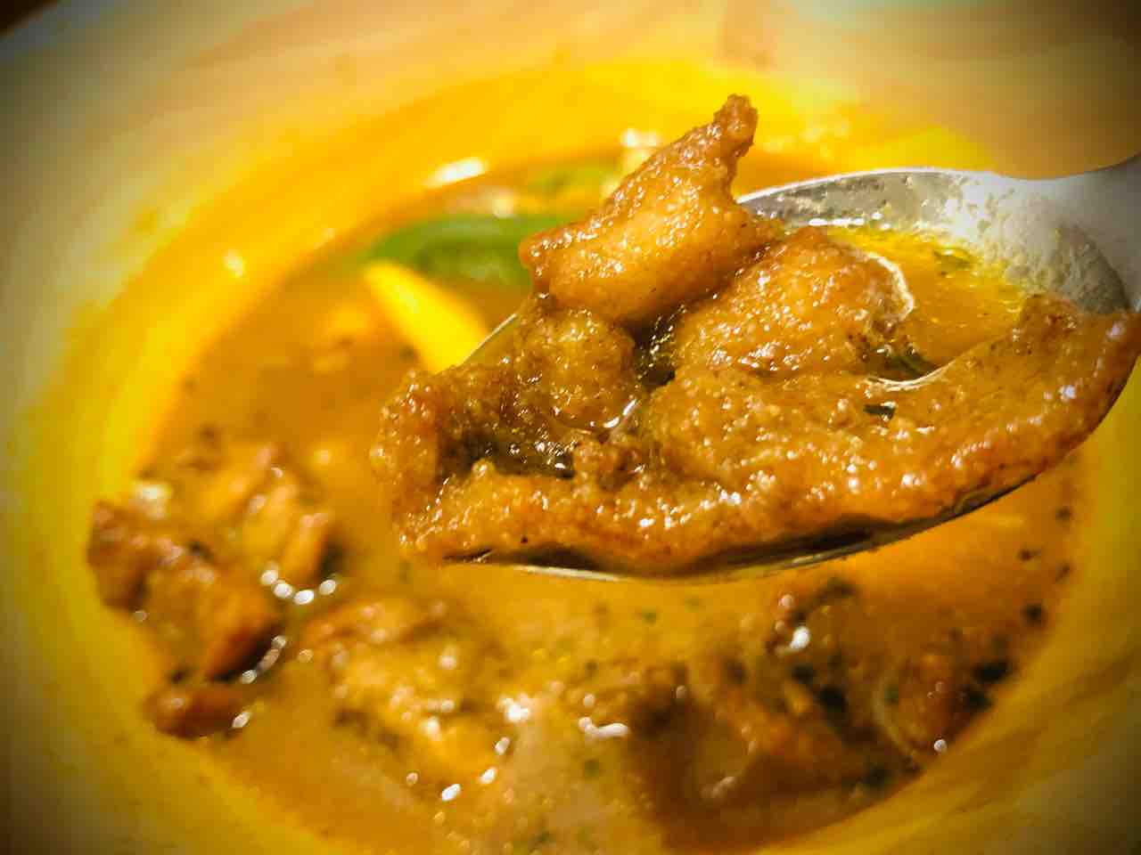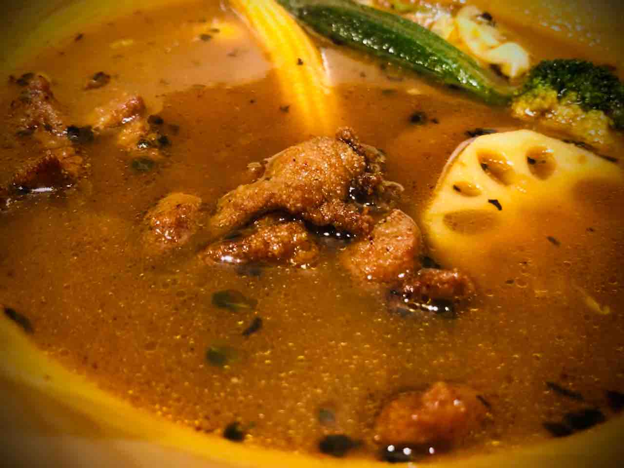 唐揚げホルモンが入っているスパイシーなスープカレーです。