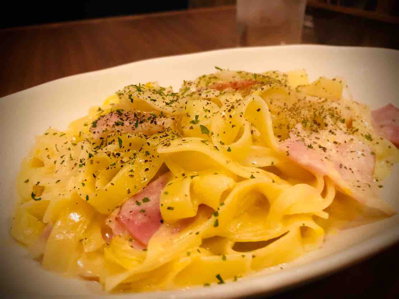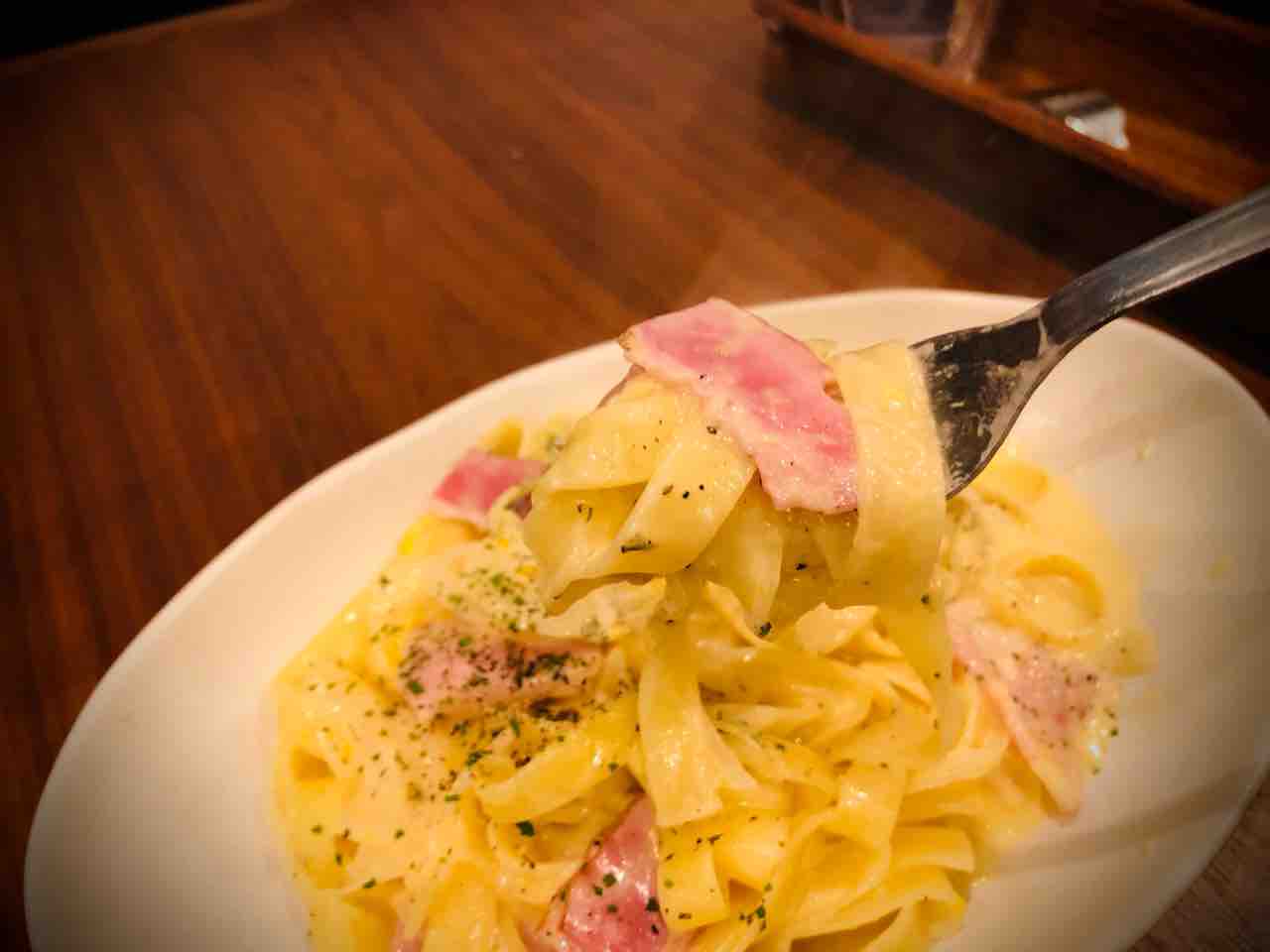 平打ち麺はモチっとしていてソースは塩気の少し強めな感じもしますがクリーミーで美味しく頂けました。