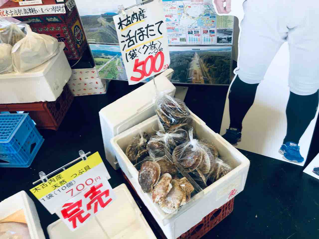 入館すると 木古内産の活ほたて、つぶ貝、カレイ等 海産物が販売されておりました。少し前に木古内に訪れた時にも販売されていたので 毎週末で販売されているのか、それともイベント?どうなんでしょうかね。