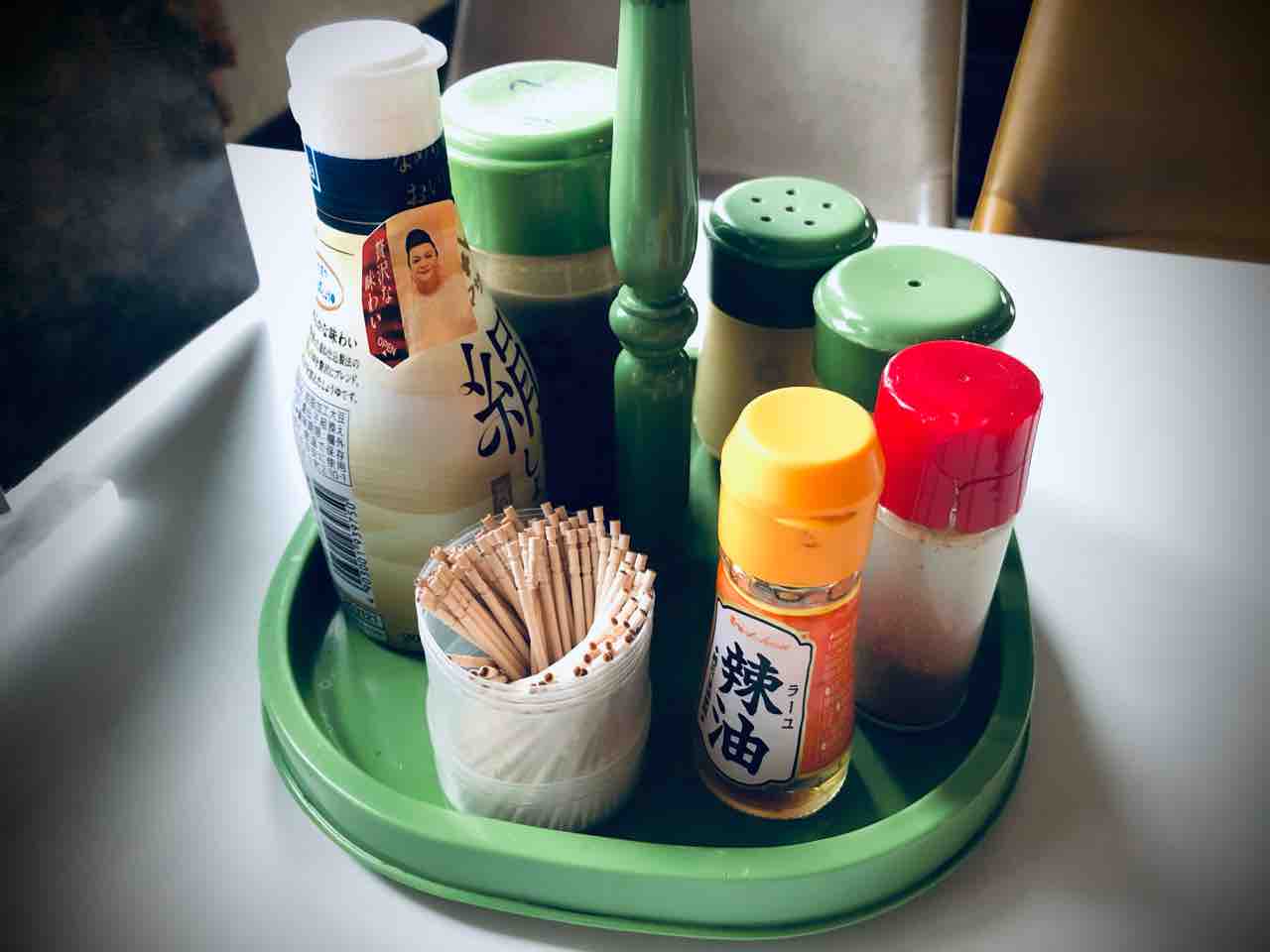 調味料もテーブルの上に配備されています。