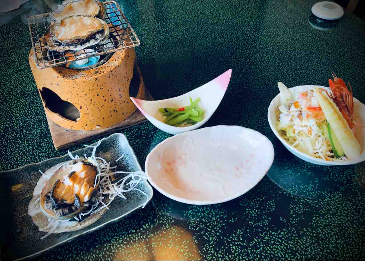 鮑の刺身と海鮮サラダ、その他ぎ運ばれてきます