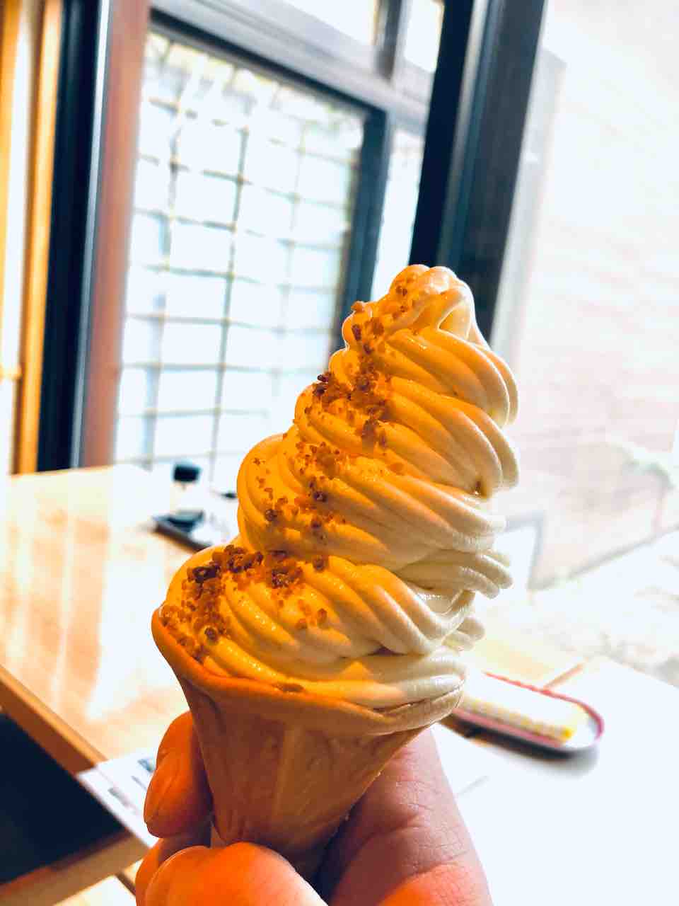 飴色に輝く表面に細かい栗が振り掛けられたソフトクリームになります。
