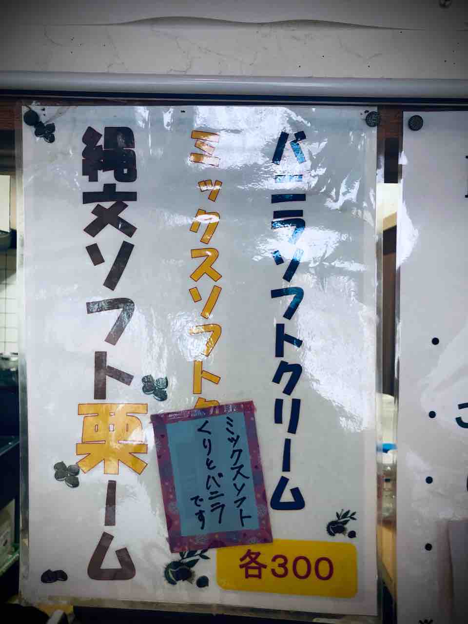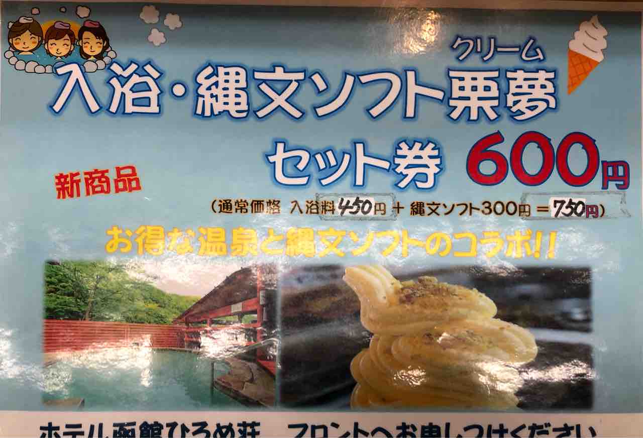 ひろめ荘のソフトクリーム 縄文ソフト栗夢 (300円税込)をキメたいと思います。今回は入浴料にソフト代も含まれているので 上記値段よりお得にソフトクリームを頂けます。