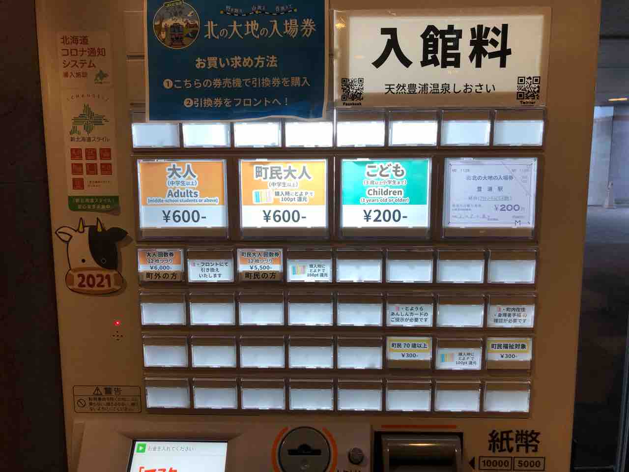 発券機にてチケットを購入して温泉に入ります。大人は600円税込で 浴場にはリンスインシャンプーとボディソープは備え付けてあります。