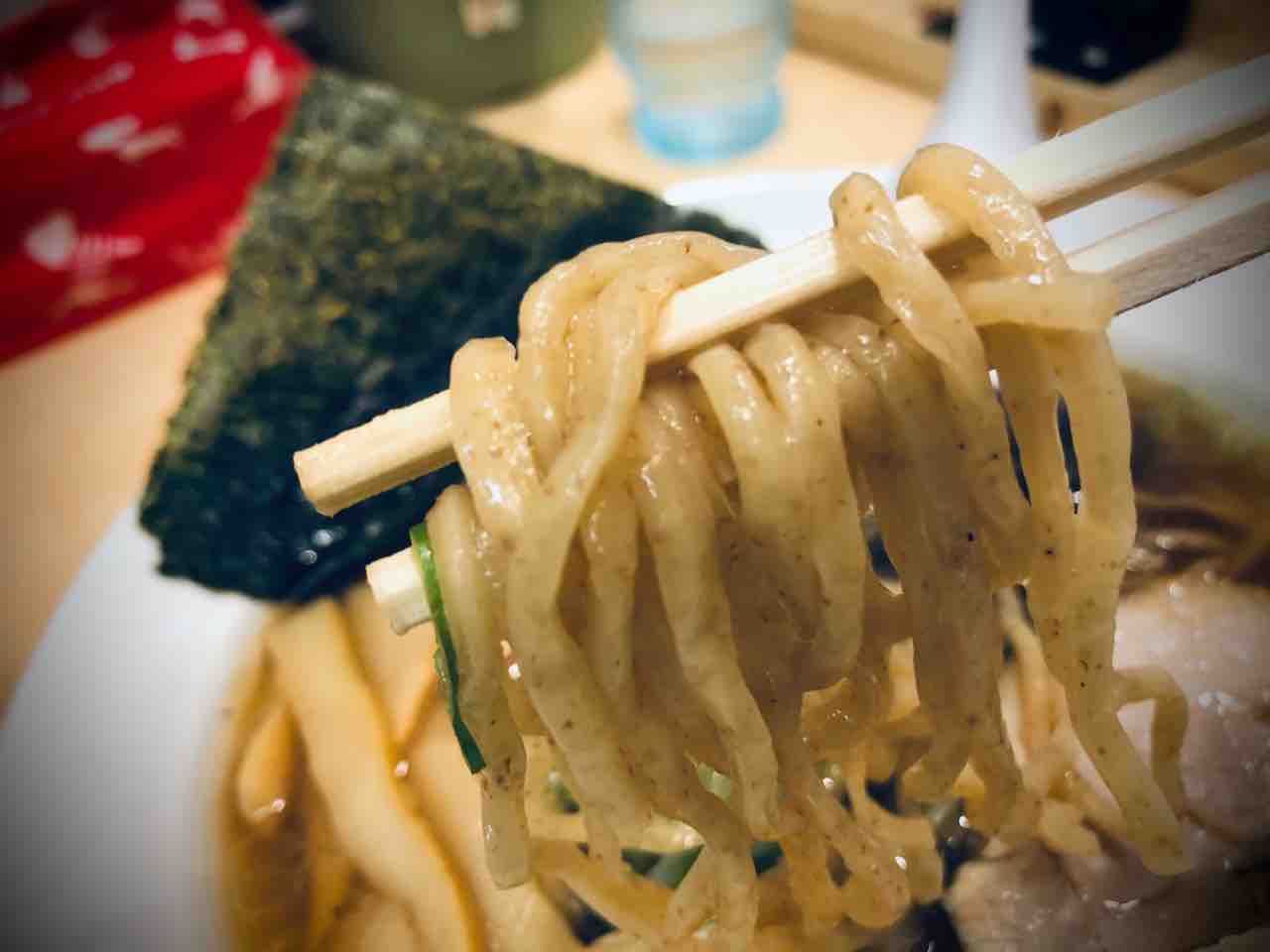 ライ麦麺は中太のストレート麺で麺には黒い点がポツポツと見えるので これがライ麦なんでしょうかね?麺を頂くと甘味がありツルっといける麺で美味しいです。