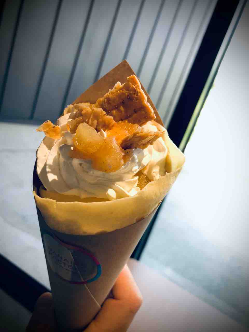 それから数分のちに 七飯りんごカスタードパイのクレープと りんごシェイク を受け取りまして こちらがクレープで