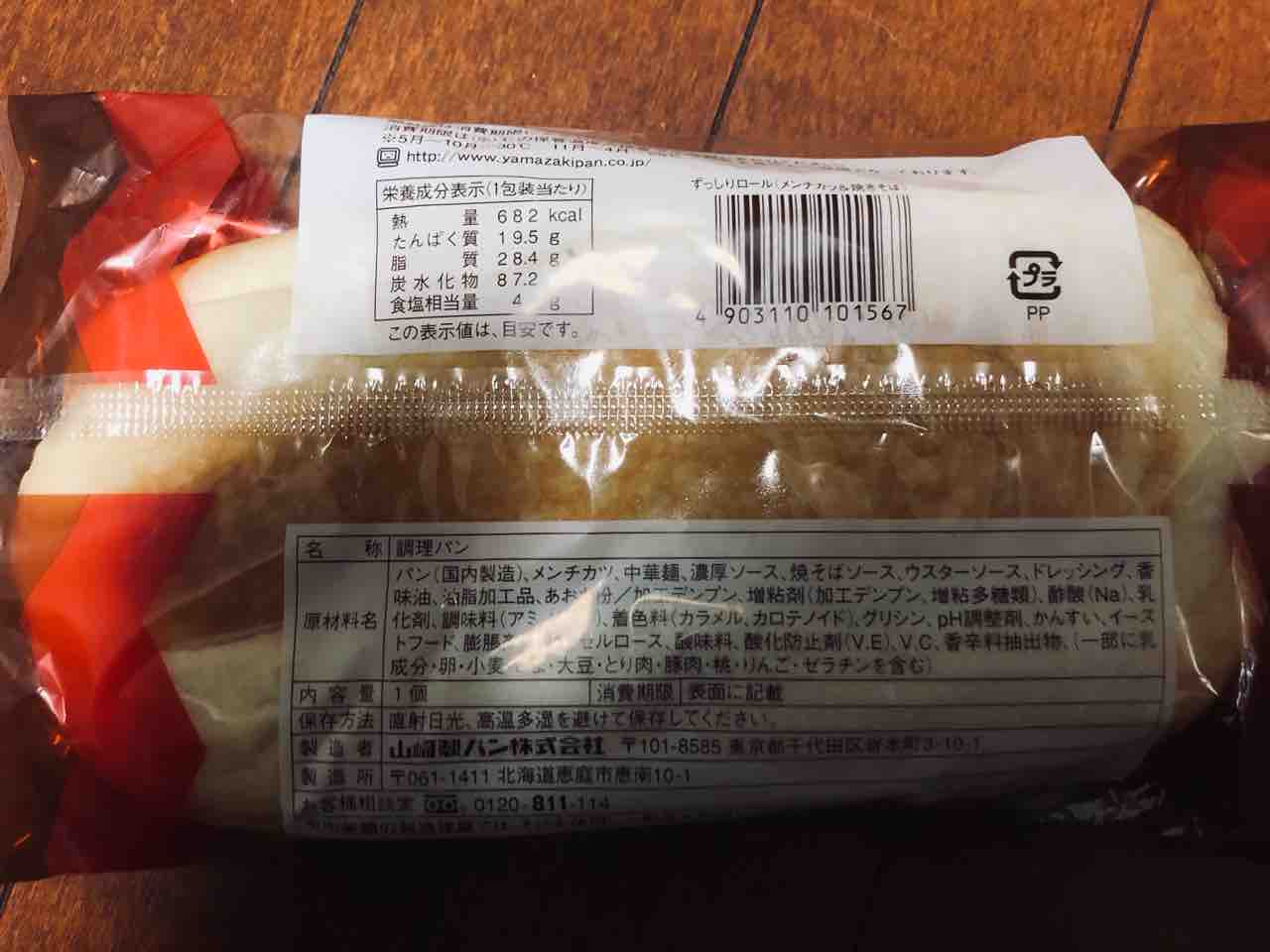 カロリーは682kcal タンパク質19.5g 脂質28.4g 炭水化物87.2g 食塩相当量4g。パンに焼きそばにメンチカツ 相当な好カロリーで御座いました