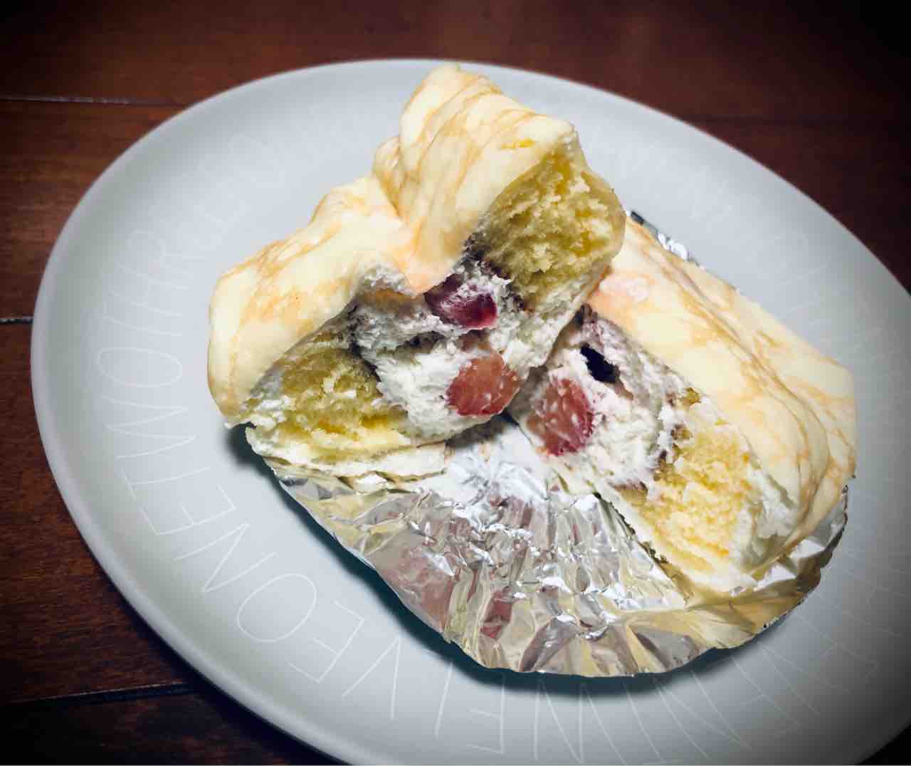 中はクレープ生地、スポンジきし、生クリーム、苺のシンプルな構成になっております頂きます… うん普通に美味しい生クリームと苺の甘酸っぱさって鉄板ですよねハズレはない 美味しくいただけました。